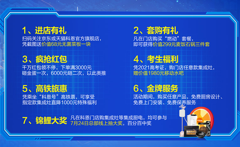 特權(quán)一進店有禮:掃碼關(guān)注京東或天貓集成灶十大品牌、廚電行業(yè)十大品牌科恩官方旗艦店,憑截圖送價值68元無菌菜板一塊;特權(quán)二套購有禮:凡在門店購買“燃動套餐”,即可獲得價值299元麥飯石鍋三件套;特權(quán)三瘋搶紅包:千萬紅包領(lǐng)不停,下單滿3000元即可砸金蛋一次,6000元即可砸兩次,以此類推;特權(quán)四考生福利:憑2021高考證,購門店任意款集成灶,贈價值1980元移動水吧;特權(quán)五高鐵旅惠:憑乘坐“科恩號”高鐵票,可享受指定款集成灶直降1000元特殊福利;特權(quán)六金牌服務(wù):活動期間購買任意產(chǎn)品,免費廚房設(shè)計、免費上門安裝、免費保養(yǎng)服務(wù);特權(quán)七錦鯉大獎:凡在科恩門店購集成灶等集成廚電,均可參與7月24日總部線上抽大獎,百分百中獎;買廚電選科恩,七大特權(quán)享不停,7月24日總部線上大抽獎,現(xiàn)場抽取多個錦鯉大獎,百分百中獎,蒸/烤箱、移動水吧、高端指紋鎖、品牌掛燙機等等超值禮品等你拿!這個七月最燃是科恩,下個錦鯉就是你~