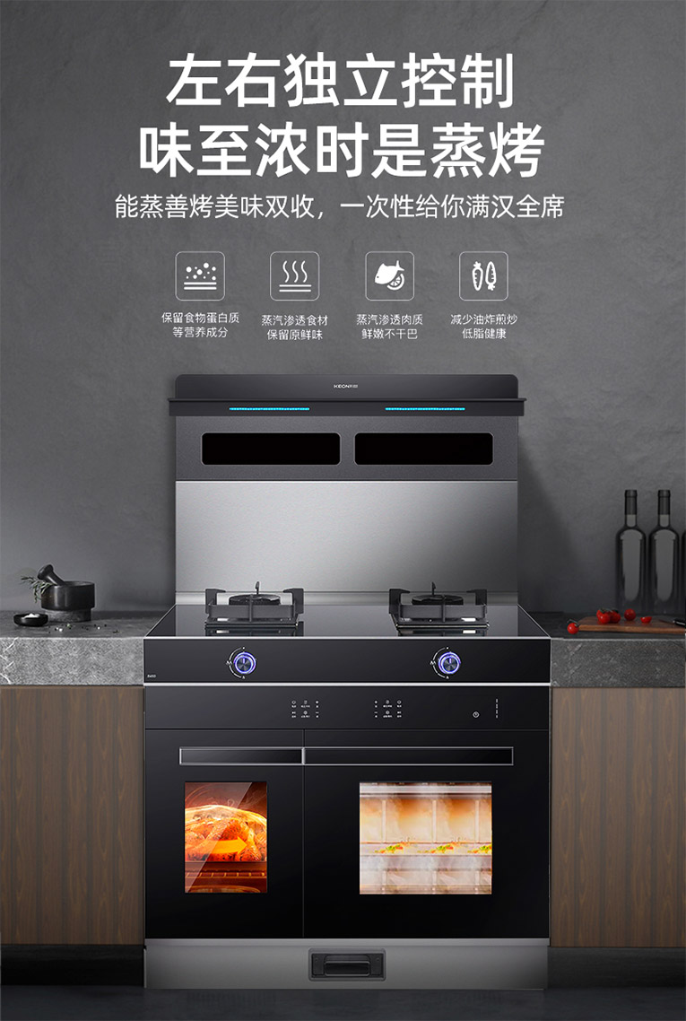 科恩S450左右蒸烤集成灶還擁有智能電加熱熱清洗功能,自動(dòng)電加熱,保持大吸力,省去用戶手動(dòng)清洗的麻煩,避免了機(jī)器內(nèi)部藏污納垢。