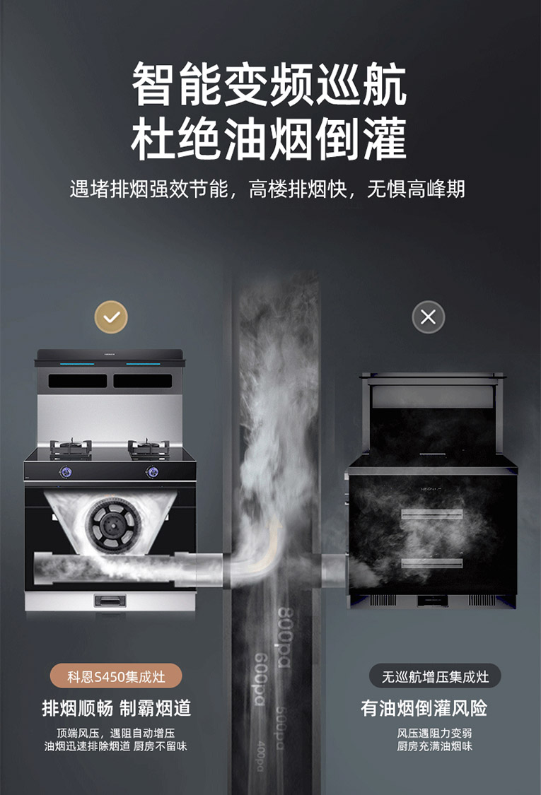S450智能語音左右蒸烤集成灶采用20m3/min大吸力,720Pa大風(fēng)壓,低空封鎖油煙升騰區(qū),吸凈雙灶爆炒煙,搭載智能變頻巡航,遇堵排煙強(qiáng)效節(jié)能,高效排煙快,杜絕油煙倒灌。