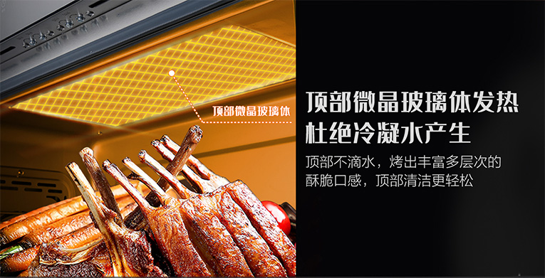 烤箱模式采用200℃高溫烤技術(shù),頂部微晶玻璃體發(fā)熱,精準(zhǔn)控溫,每一秒都精準(zhǔn)控制,保證了食材的受熱均勻,烤出豐富多層次的酥脆口感。