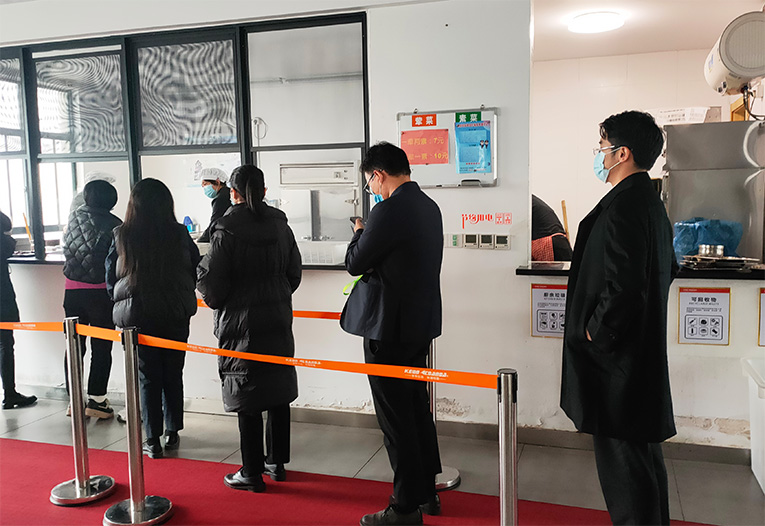 疫情期間,科恩實行錯峰就餐、排隊取餐保持1米距離、間隔就坐等,保證距離,減少交談。