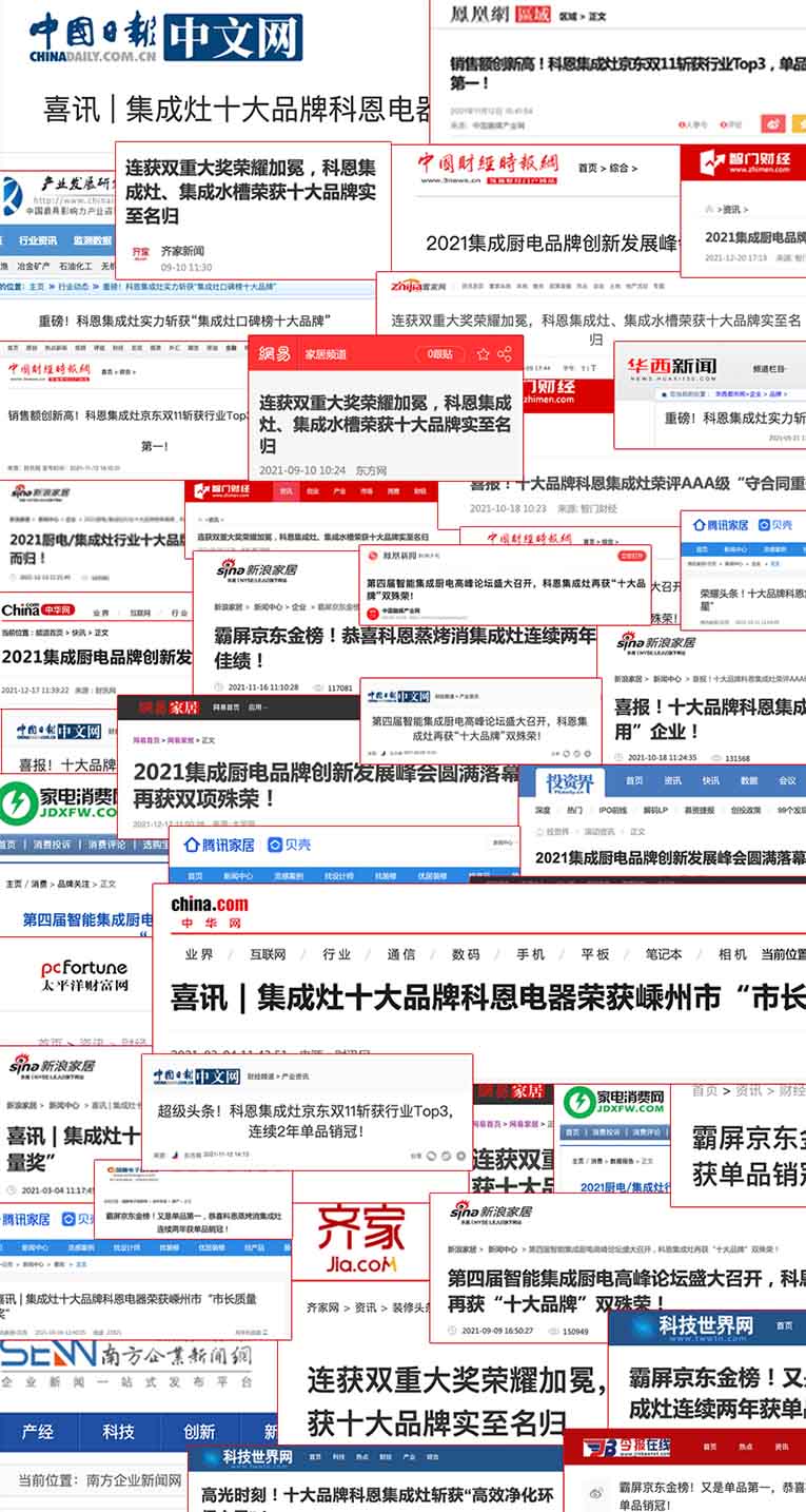 是榮譽(yù),更是責(zé)任,酒香不怕巷子深,科恩集成灶十二余年品牌沉淀,始終保持初心砥礪前行,得到越來(lái)越多用戶的認(rèn)可,備受市場(chǎng)、消費(fèi)者關(guān)注,百余家媒體爭(zhēng)相報(bào)道,為科恩高速發(fā)展做出了積極的貢獻(xiàn)。