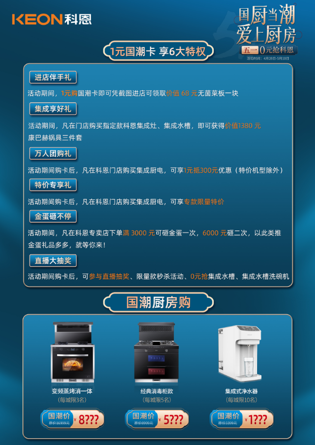 凡是購(gòu)買(mǎi)1元國(guó)潮卡的用戶即可參與直播大抽獎(jiǎng)活動(dòng):無(wú)菌菜板、PP棉濾芯、便攜榨汁杯、凈水龍頭、章丘鐵鍋、康巴赫鍋具三件套、集成水槽、集成水槽洗碗機(jī)...海量壕禮發(fā)不停?。?!活動(dòng)精彩紛呈,直播間也熱鬧非凡,全國(guó)各地的朋友們積極參與,用指尖傳遞著國(guó)廚當(dāng)潮,愛(ài)上廚房的精致廚房新理念。