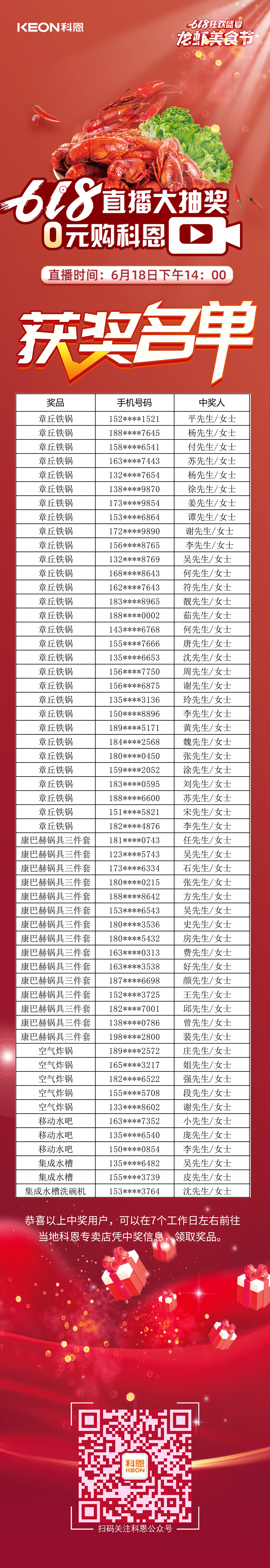 萬(wàn)人品美食,0元搶科恩——科恩龍蝦美食節(jié)圓滿落幕,千城千店,共襄盛舉,感謝大家對(duì)科恩集成灶的大力支持,618直播大抽獎(jiǎng)獲獎(jiǎng)名單火熱出爐,恭喜以上獲獎(jiǎng)的小伙伴們,請(qǐng)盡快聯(lián)系當(dāng)?shù)?a href="http://m.xiezimenhu.com/" target="_blank">科恩門店,快把獎(jiǎng)品領(lǐng)回家吧!