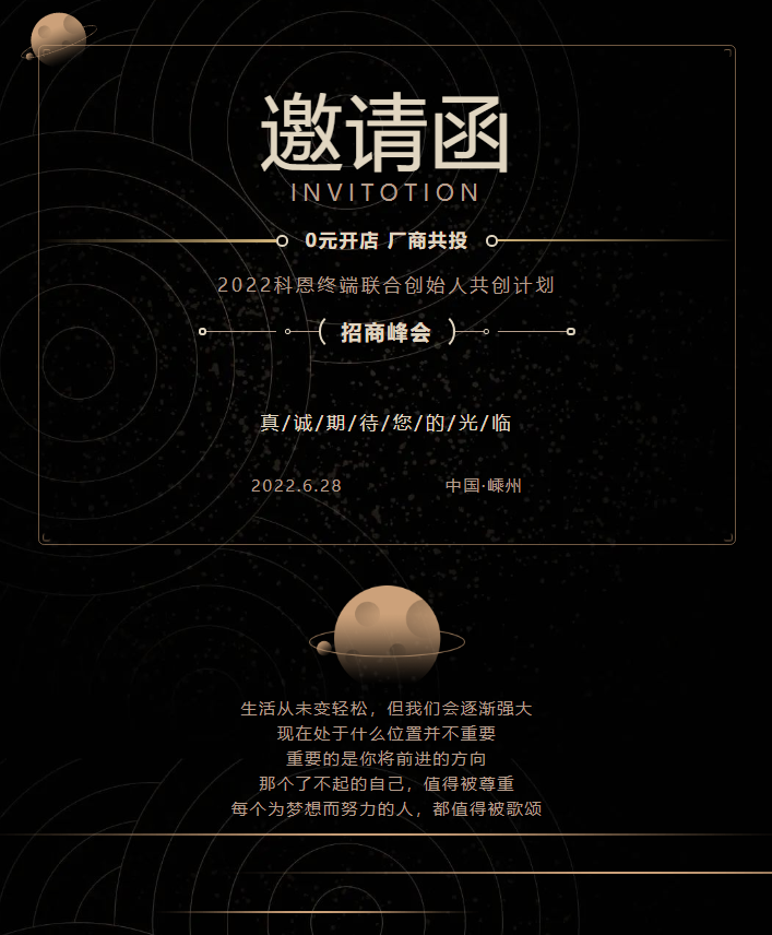 生活從未變輕松,但我們會(huì)逐漸強(qiáng)大,現(xiàn)在處于什么位置并不重要,重要的是你將前進(jìn)的方向,那個(gè)了不起的自己,值得被尊重,每個(gè)為夢(mèng)想而努力的人,都值得被歌頌!誠(chéng)邀您參加2022年6月28日在浙江嵊州,由浙江科恩電器有限公司主辦的「0元開(kāi)店,廠(chǎng)商共投」2022年科恩終端聯(lián)合創(chuàng)始人共創(chuàng)計(jì)劃暨招商峰會(huì),并真誠(chéng)期望我們于此次活動(dòng)共享藍(lán)海市場(chǎng)商業(yè)機(jī)會(huì)的同時(shí),商討雙方企業(yè)發(fā)展策略,共同揭開(kāi)科恩集成灶品牌的神秘面紗。