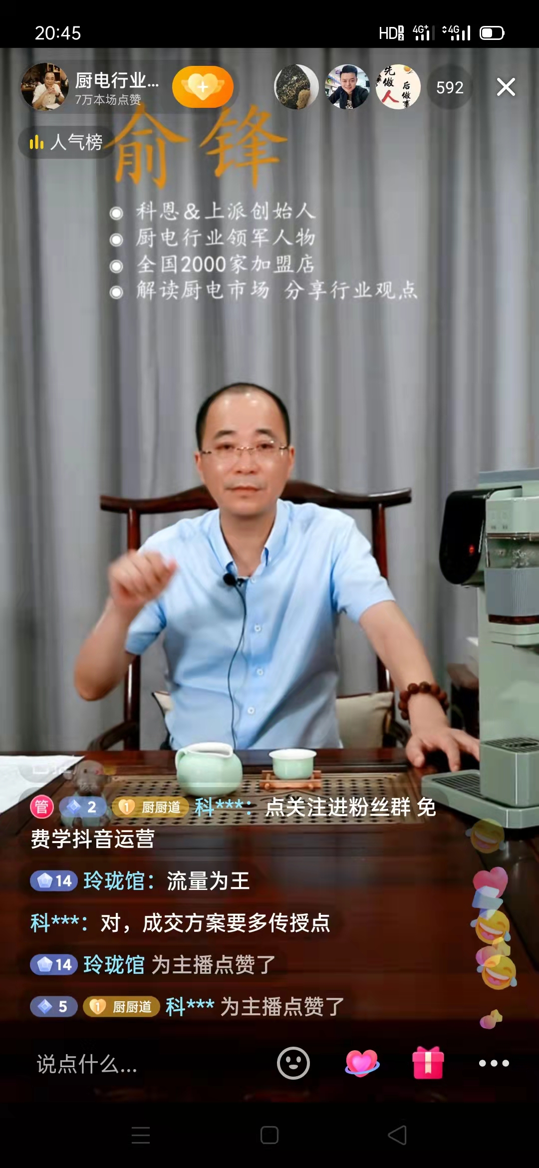 直播從19:30準(zhǔn)時開始,俞總在大家的萬眾期待中閃耀亮相,集團(tuán)董事、廚電大咖效應(yīng)使得眾多業(yè)內(nèi)外精英及投資創(chuàng)業(yè)者紛紛進(jìn)入直播間聆聽取經(jīng),同時,豐富的直播福利和俞總娓娓道來、由淺入深的商業(yè)思維也提升了大眾的參與度,引起了用戶對于目前經(jīng)濟(jì)形勢的廣泛關(guān)注和討論,可以說,這是一場具有戰(zhàn)略性、前瞻性、針對性的行業(yè)直播盛宴。