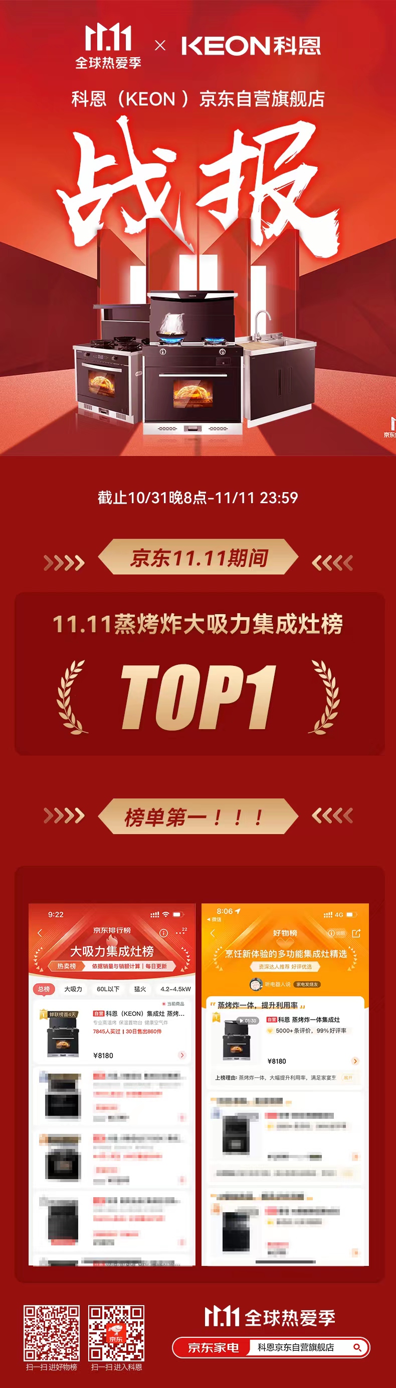 雙11全民狂歡盛宴完美落幕,科恩集成灶雙11終極戰(zhàn)報(bào)來襲,科恩集成灶火力全開,斬獲雙料第一:蒸烤炸大吸力集成灶榜TOP1,烹飪新體驗(yàn)多功能集成灶TOP1,強(qiáng)大品牌號(hào)召力毋庸置疑,科恩速度,實(shí)力盡顯!