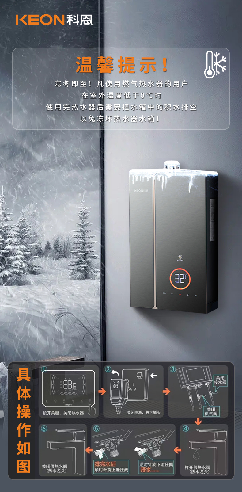 ②若熱水器凍住,請及時(shí)關(guān)閉燃?xì)忾y門與熱水器進(jìn)水閥門,并盡快進(jìn)行維修!