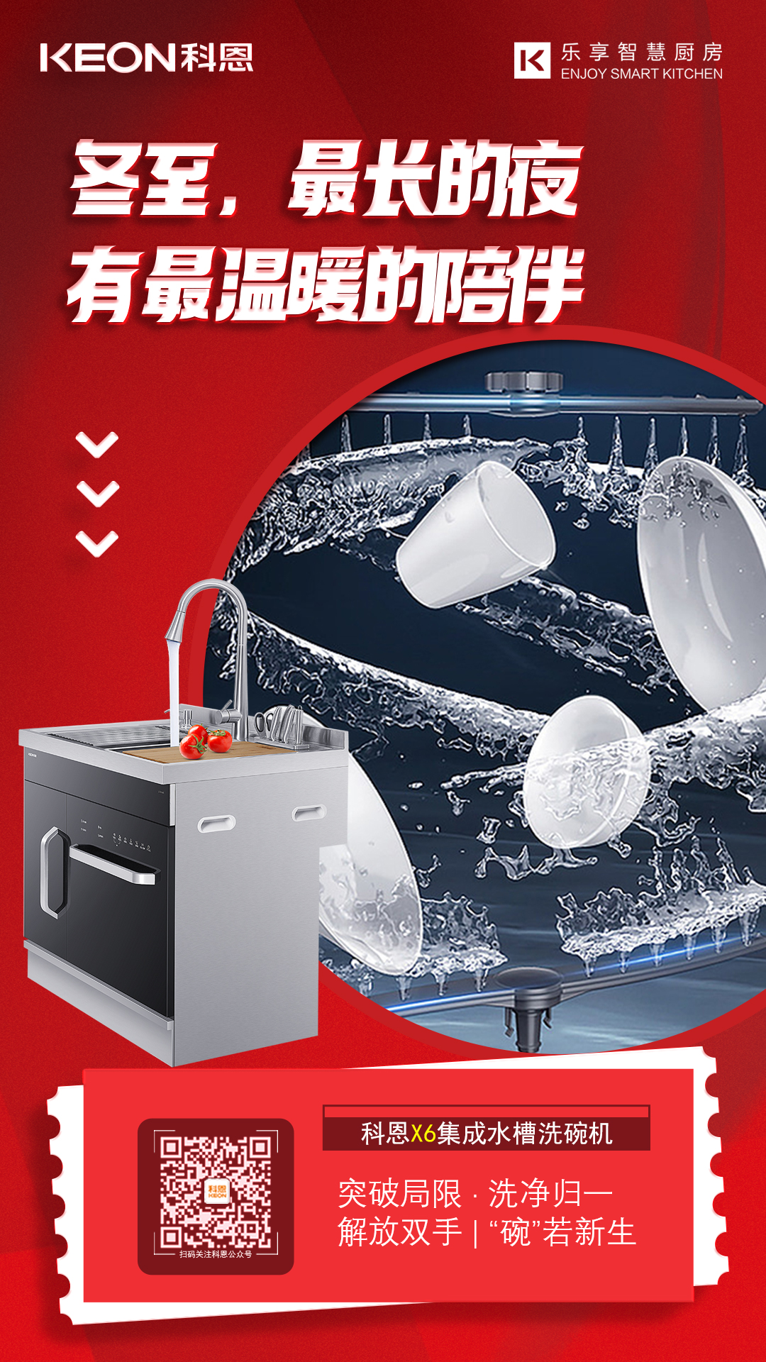 科恩集成水槽洗碗機(jī),洗消烘存儲于一體,五大清洗模式,洗果蔬,去農(nóng)殘,洗海鮮亦可輕松搞定!噴淋式循環(huán)系統(tǒng),瀑布式上下雙臂噴淋,全覆蓋高壓沖刷,高效除污自動烘干,解放雙手,“碗”若新生!