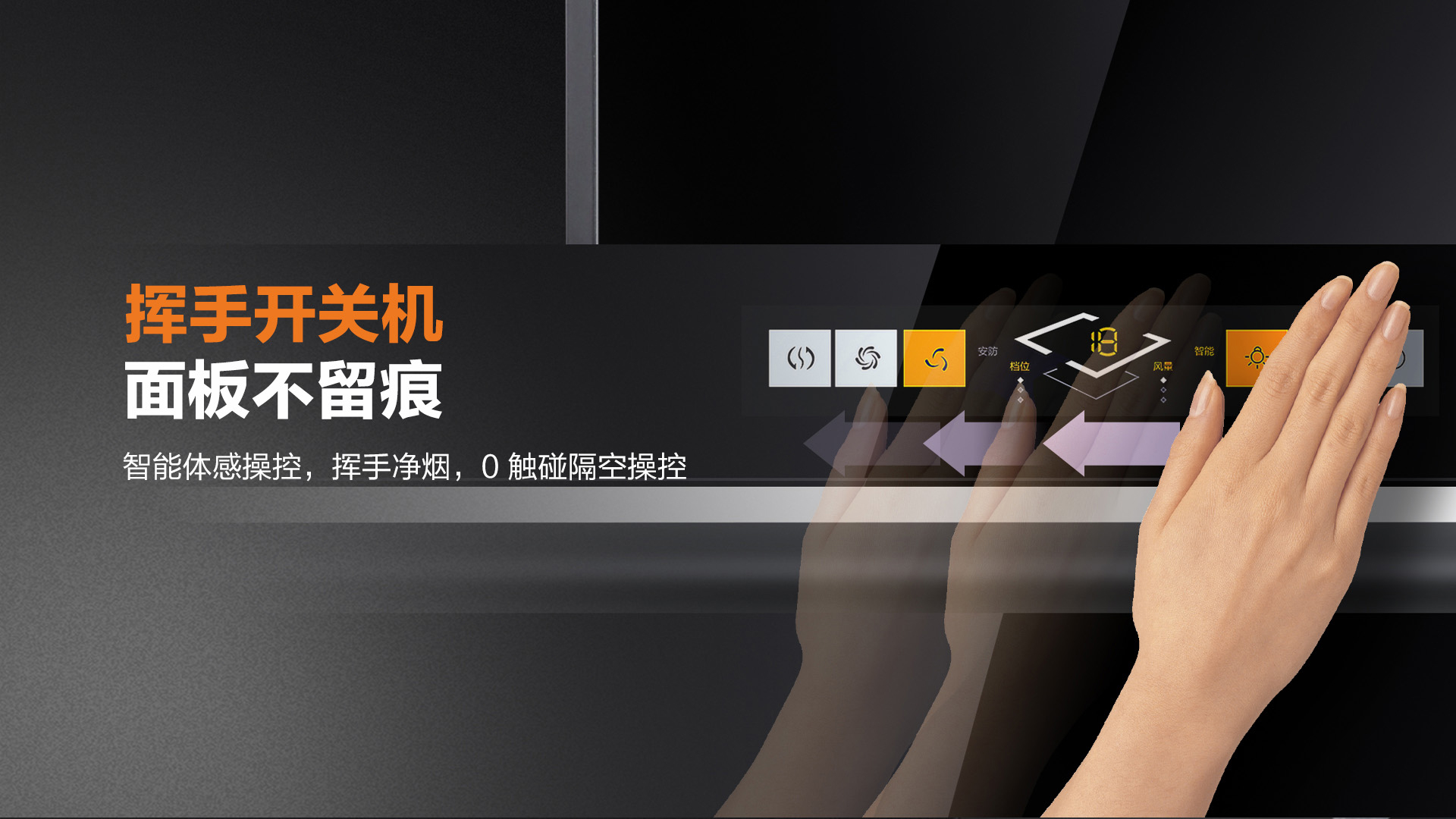 揮手開關(guān)機(jī),面板不留痕,智能體感操控,揮手凈煙,0觸碰隔空操控,廚房更潔凈!