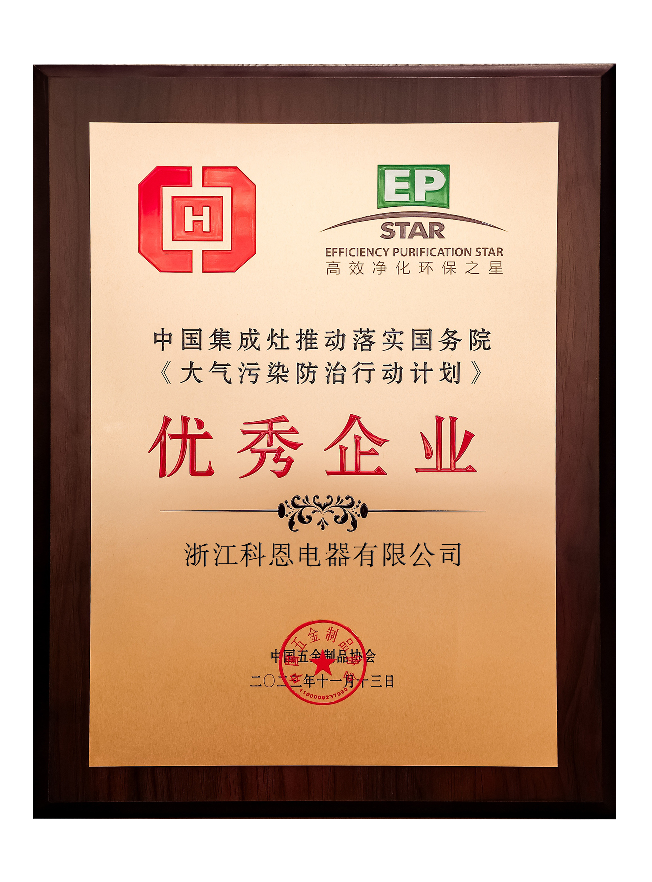 20231128日,主題為煙火人間 凈秀山河有中國五金制品協(xié)會(huì)召開的“中國五金制品協(xié)會(huì)吸油煙機(jī)分會(huì)·換屆&技術(shù)大會(huì)暨‘高效凈化環(huán)保之星’10周年慶典”在杭州隆重舉辦。會(huì)上發(fā)布了獲得本屆高效凈化環(huán)保之星優(yōu)秀企業(yè),并向多年來連續(xù)參與此項(xiàng)目并表現(xiàn)突出的企業(yè)給予了嘉獎(jiǎng)。科恩再一次榮獲中國五金制品協(xié)會(huì)-理事單位”及“中國集成灶推動(dòng)落實(shí)國務(wù)院《大氣污染防治行動(dòng)計(jì)劃》-優(yōu)秀企業(yè)”!