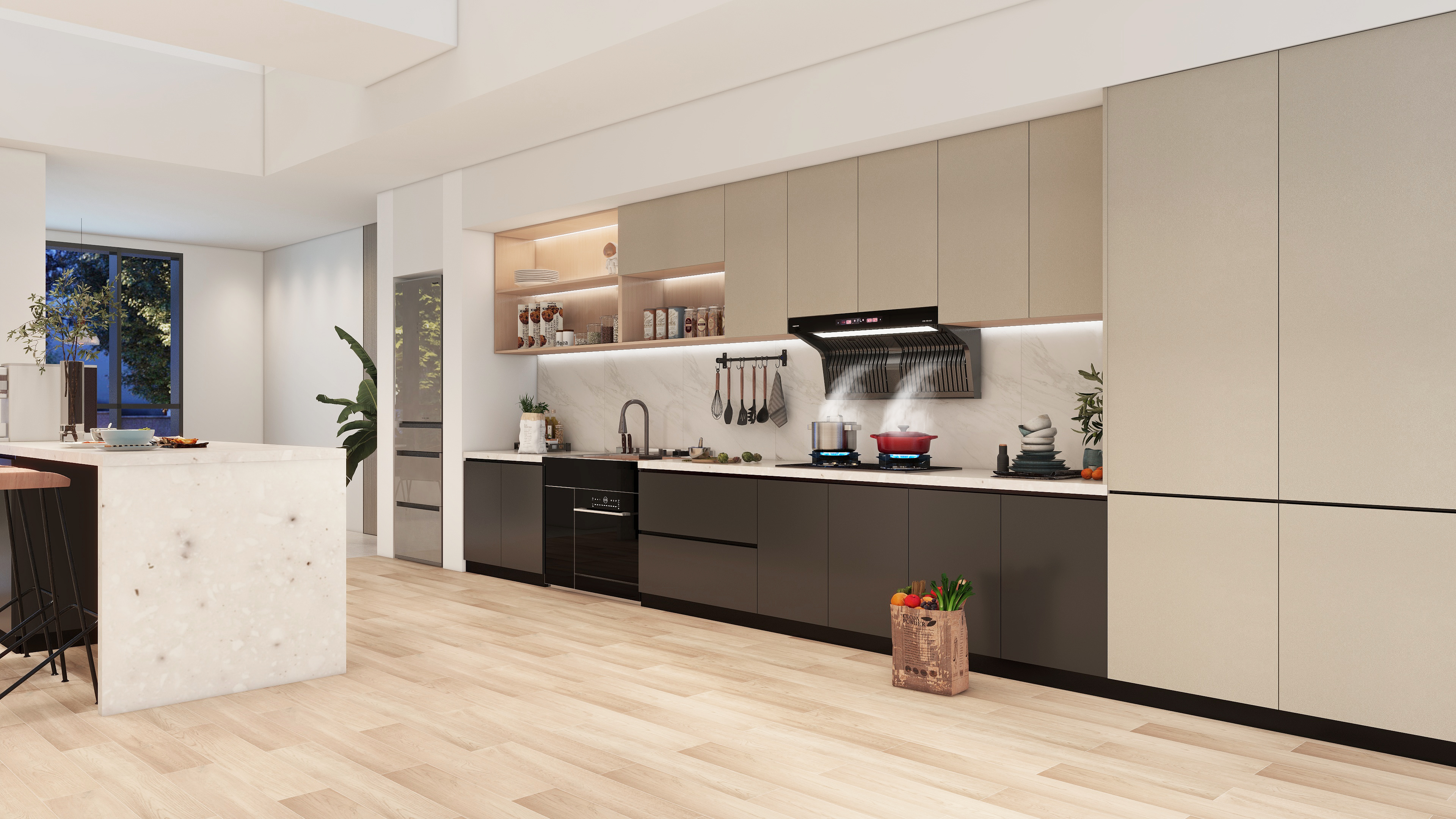 年輕一代都偏愛,半開放式及開放式廚房。一是考慮到美觀度,還有一個就是陪伴!相對于老一代悶聲在廚房烹飪,年輕一代更喜歡在烹飪的時候與家人、朋友一起聊聊天。在這種新生的趨勢中,人們對廚房的期待,已經(jīng)不僅是為了“忙活出一頓飯”。