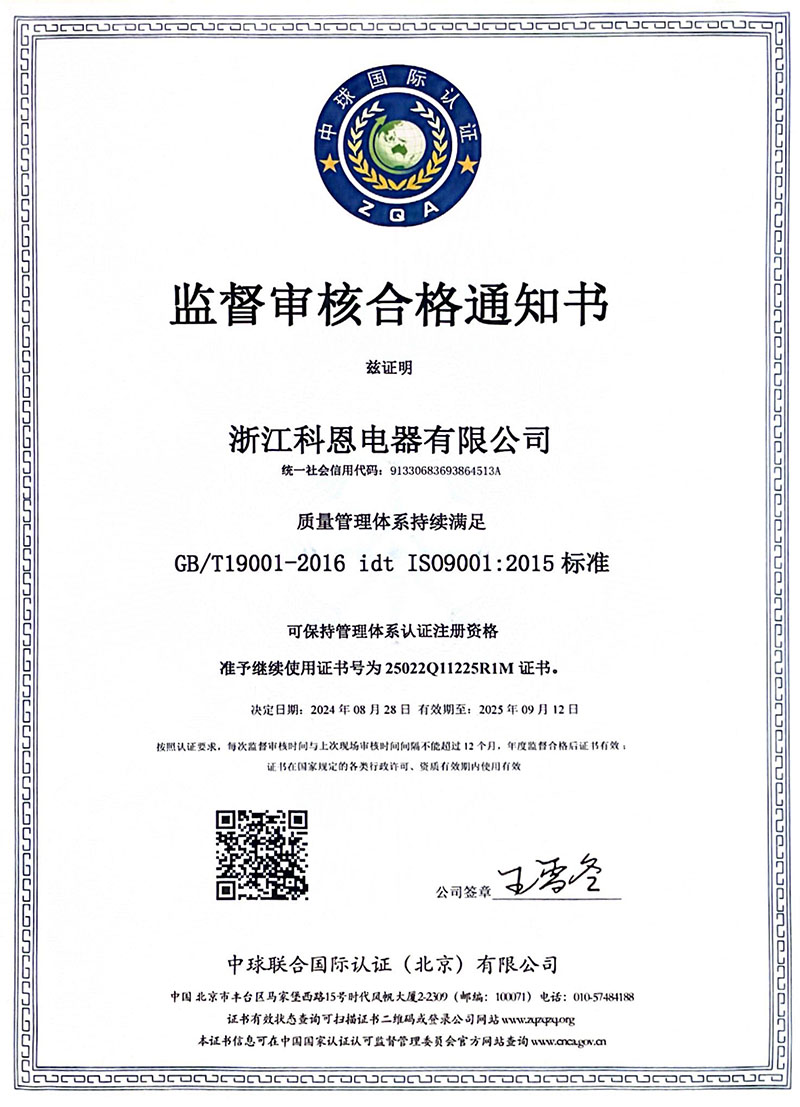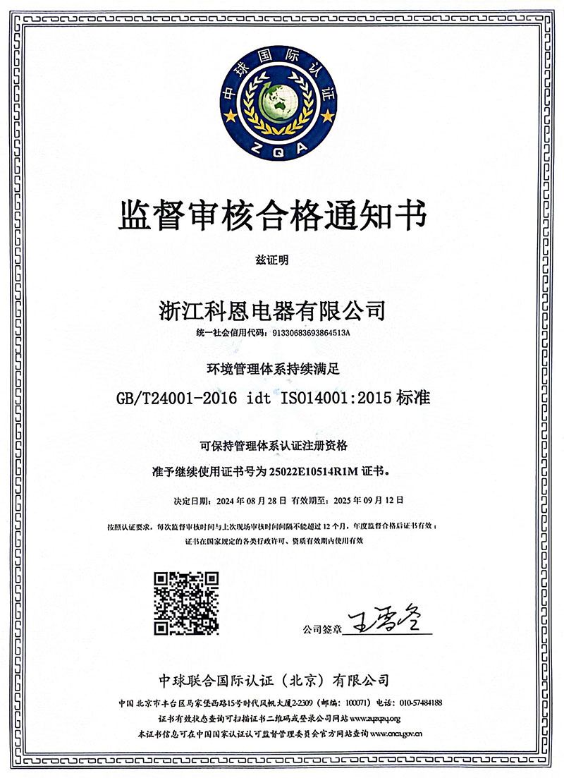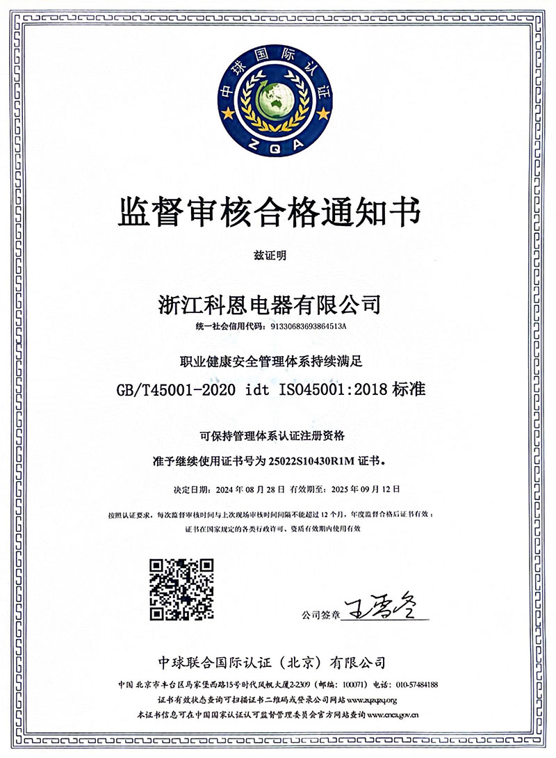 近日,浙江科恩電器有限公司經(jīng)過嚴格審核,成功獲得了質(zhì)量管理體系GB/T19001-2016(ISO9001:2015)、環(huán)境管理體系GB/T45001-2020(ISO45001:2018)以及職業(yè)健康安全管理體系GB/T24001-2016(ISO14001:2015)的三項國際標準認證。