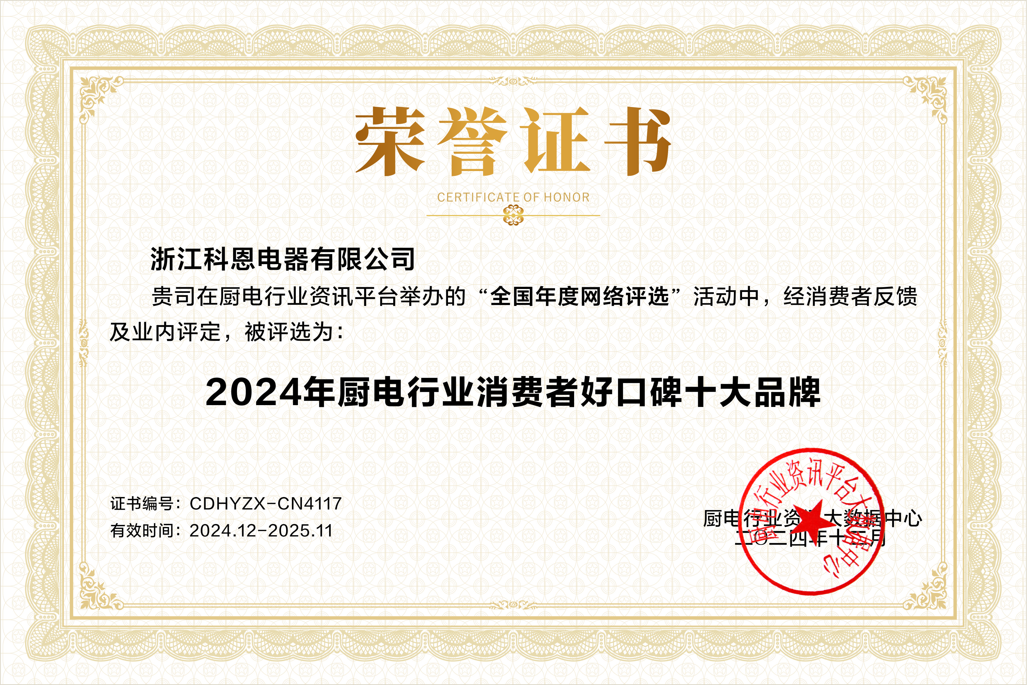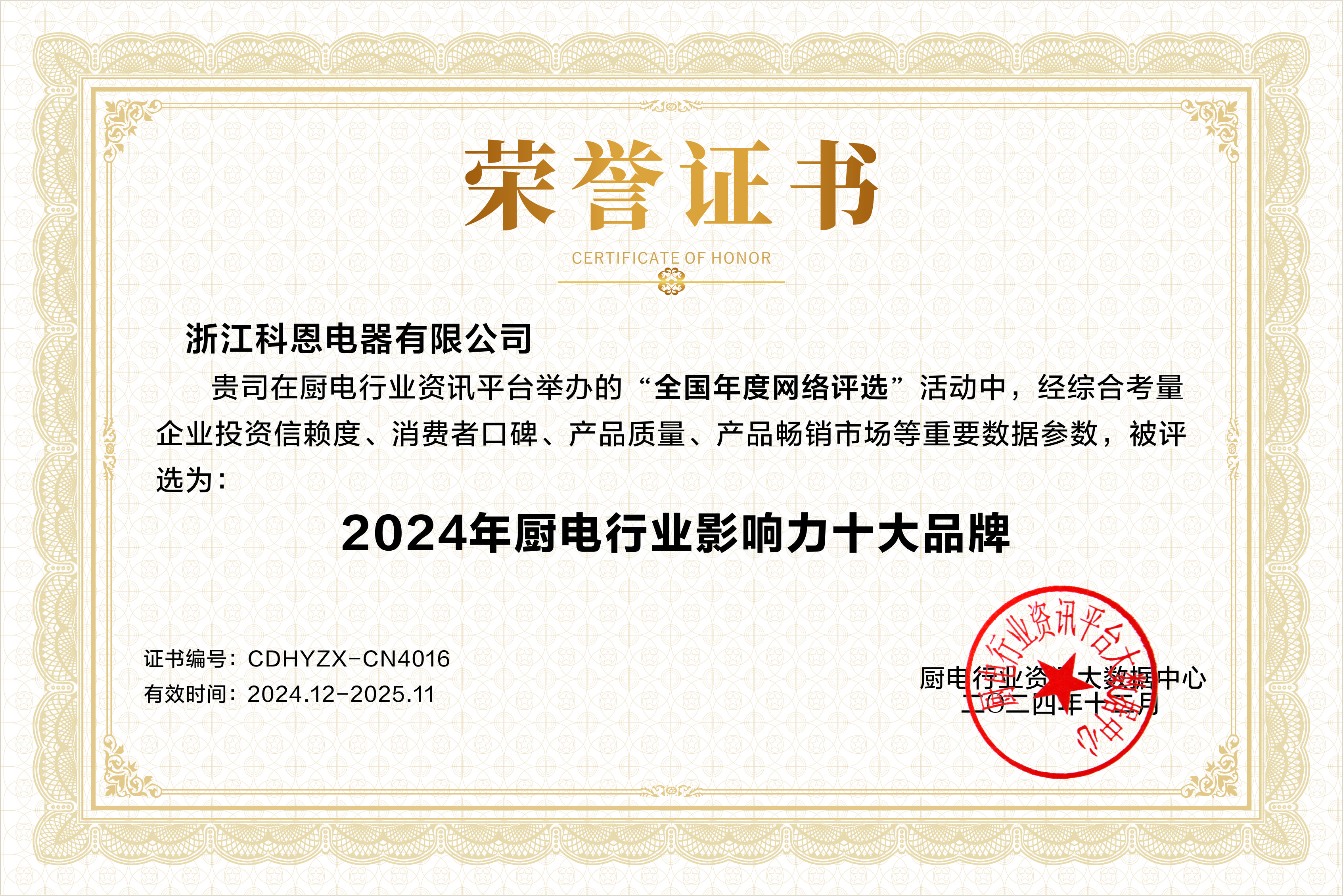 浙江科恩電器有限公司憑借其卓越的綜合實(shí)力,在眾多品牌中脫穎而出,一舉斬獲多項(xiàng)殊榮,包括2024年廚電行業(yè)影響力十大品牌、2024年廚電行業(yè)消費(fèi)者好口碑十大品牌以及2024年廚電/集成灶創(chuàng)新設(shè)計(jì)十大品牌,再度成為行業(yè)矚目的焦點(diǎn)。