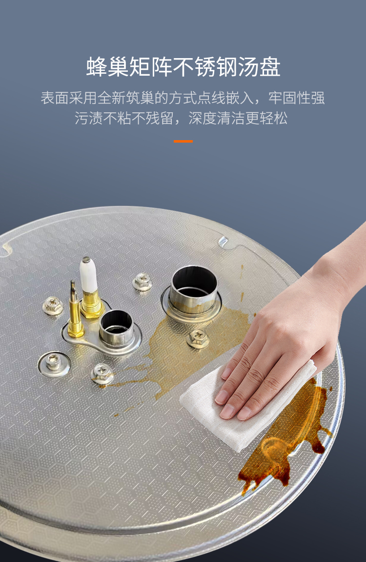 湯汁濺落,最是惱人。蜂巢矩陣工藝筑形,點線嵌入更見牢固,污漬難粘更易清理,深度清潔無需死角,廚房顏值與潔凈雙雙在線。自適應(yīng)底,換裝便捷。