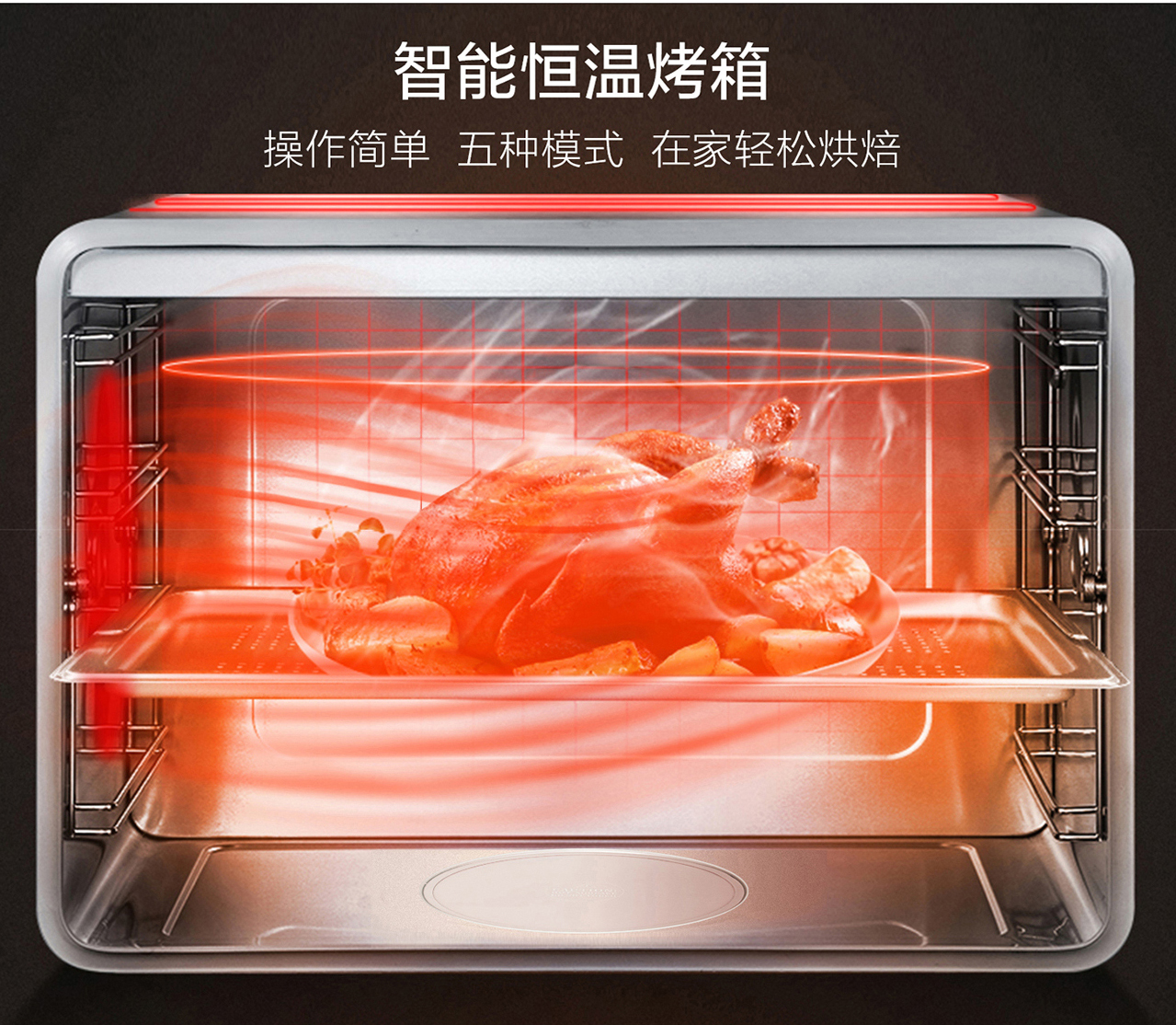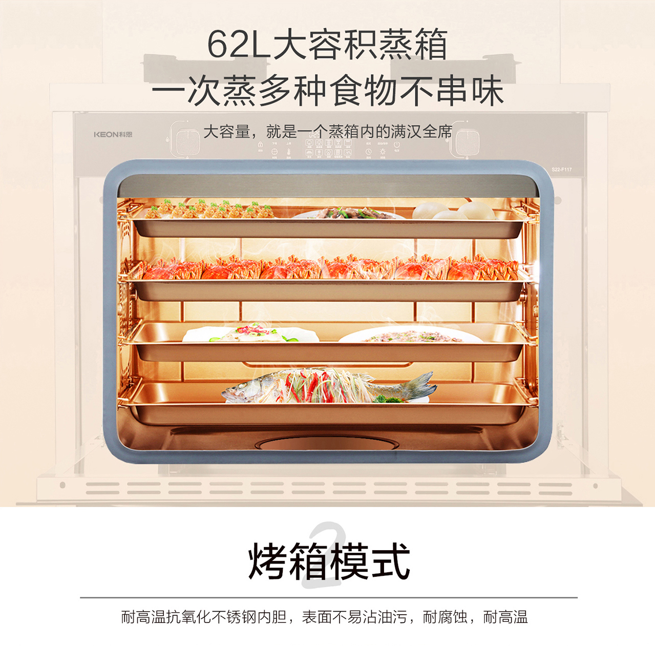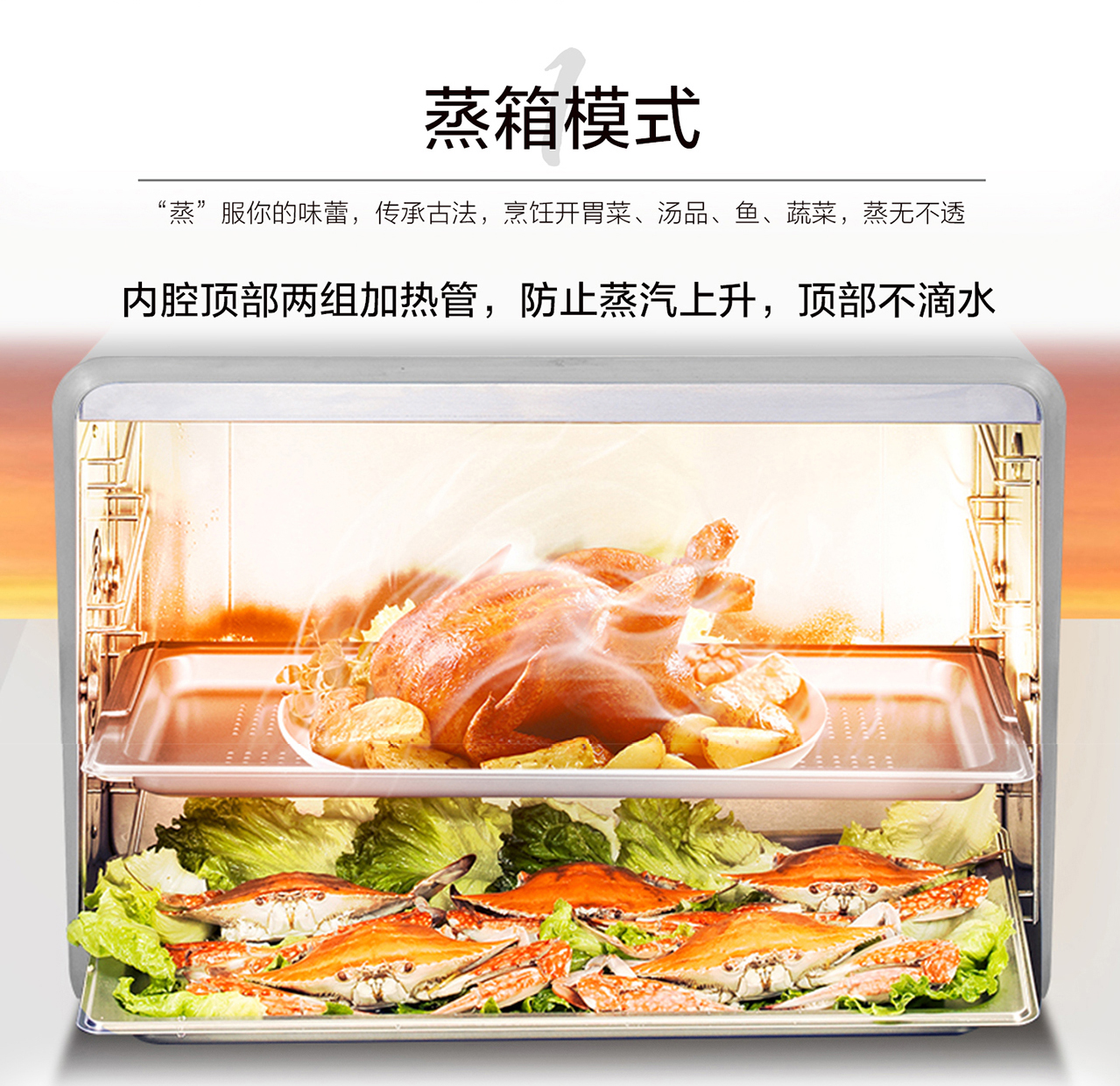 - 62L大容量食品級304不銹鋼內(nèi)膽,上下4層設(shè)計,9種蒸烤模式。