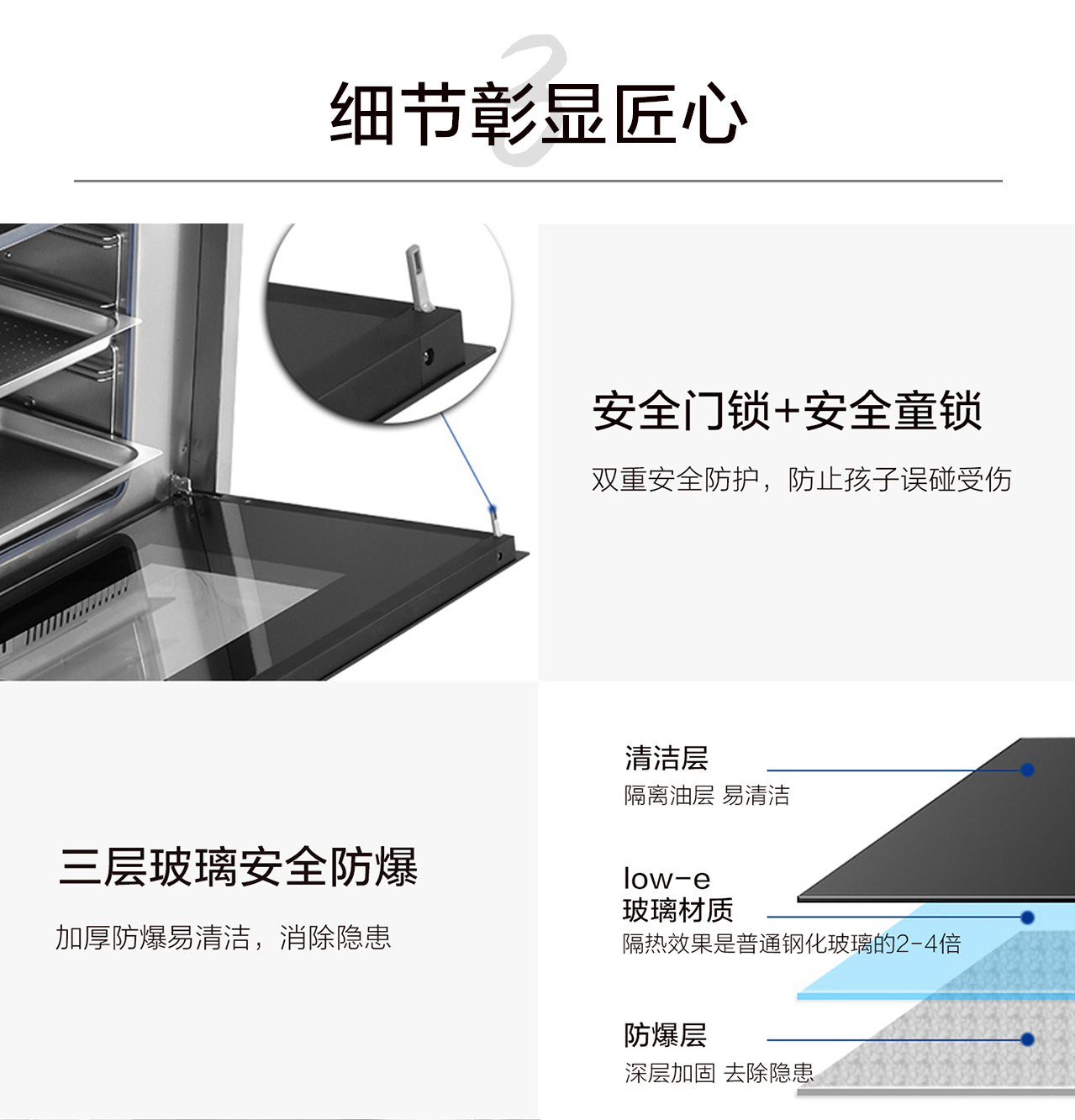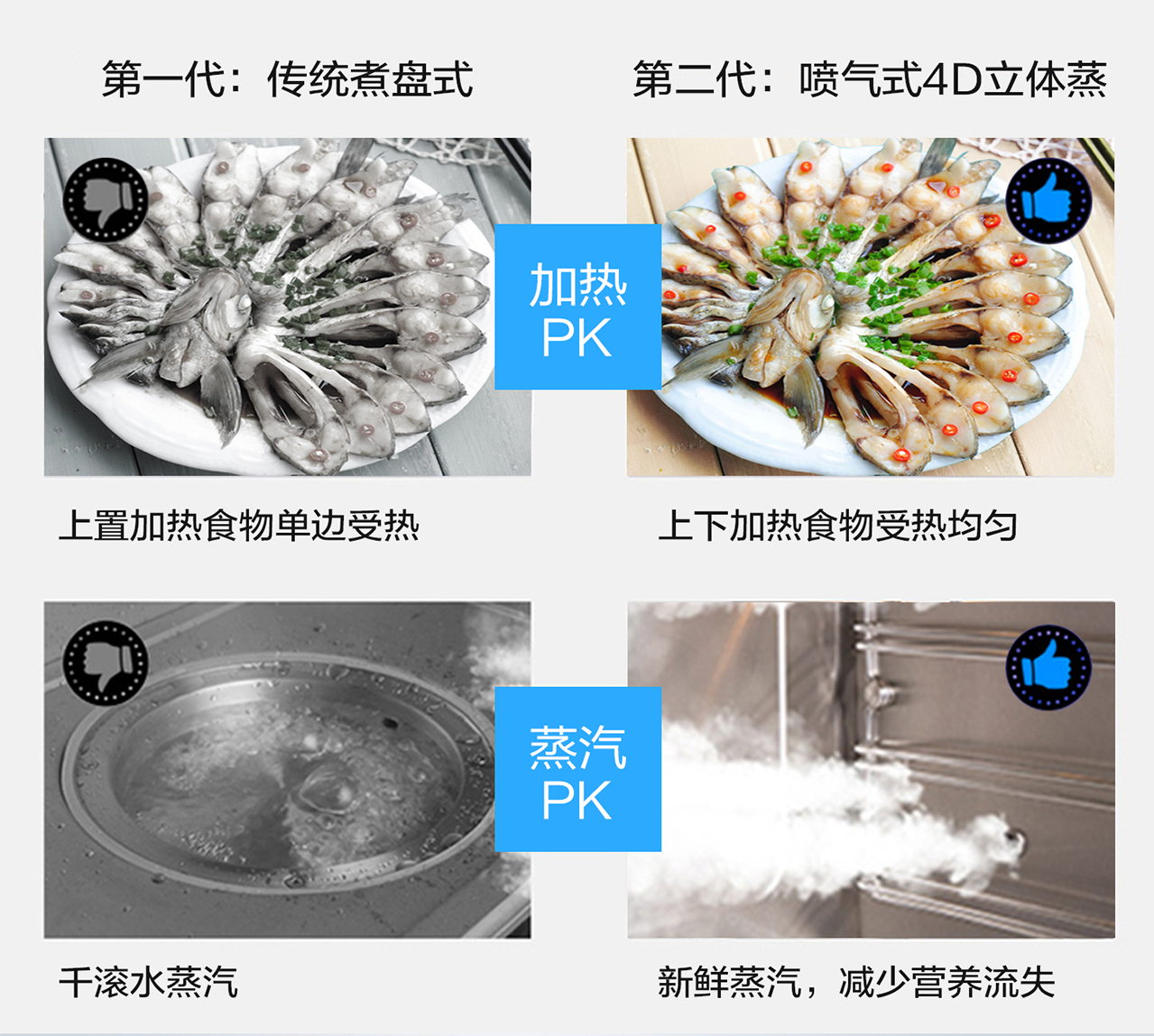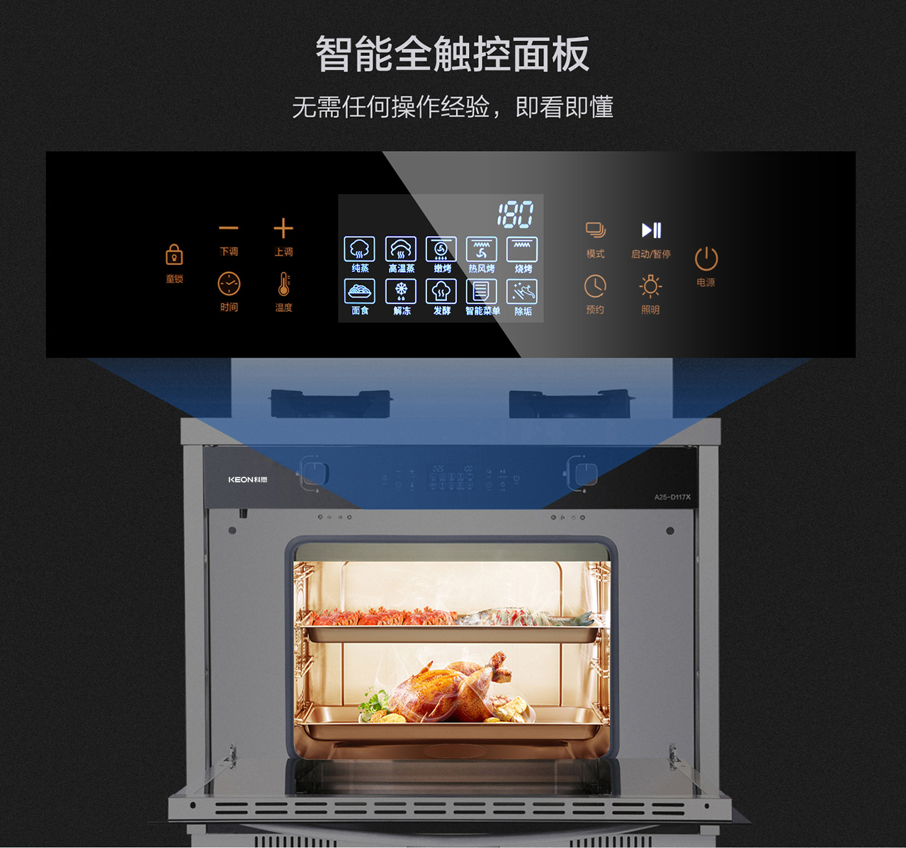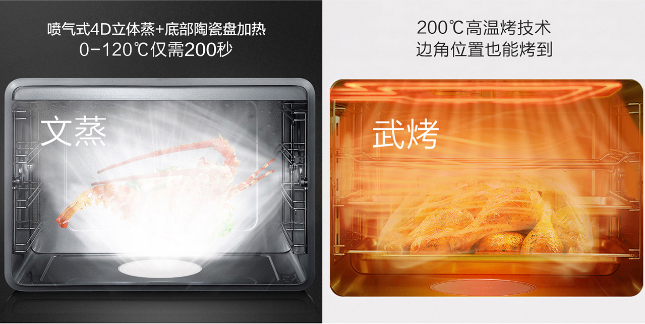 - 62L大容量食品級304不銹鋼內(nèi)膽,上下4層設(shè)計,9種蒸烤模式。