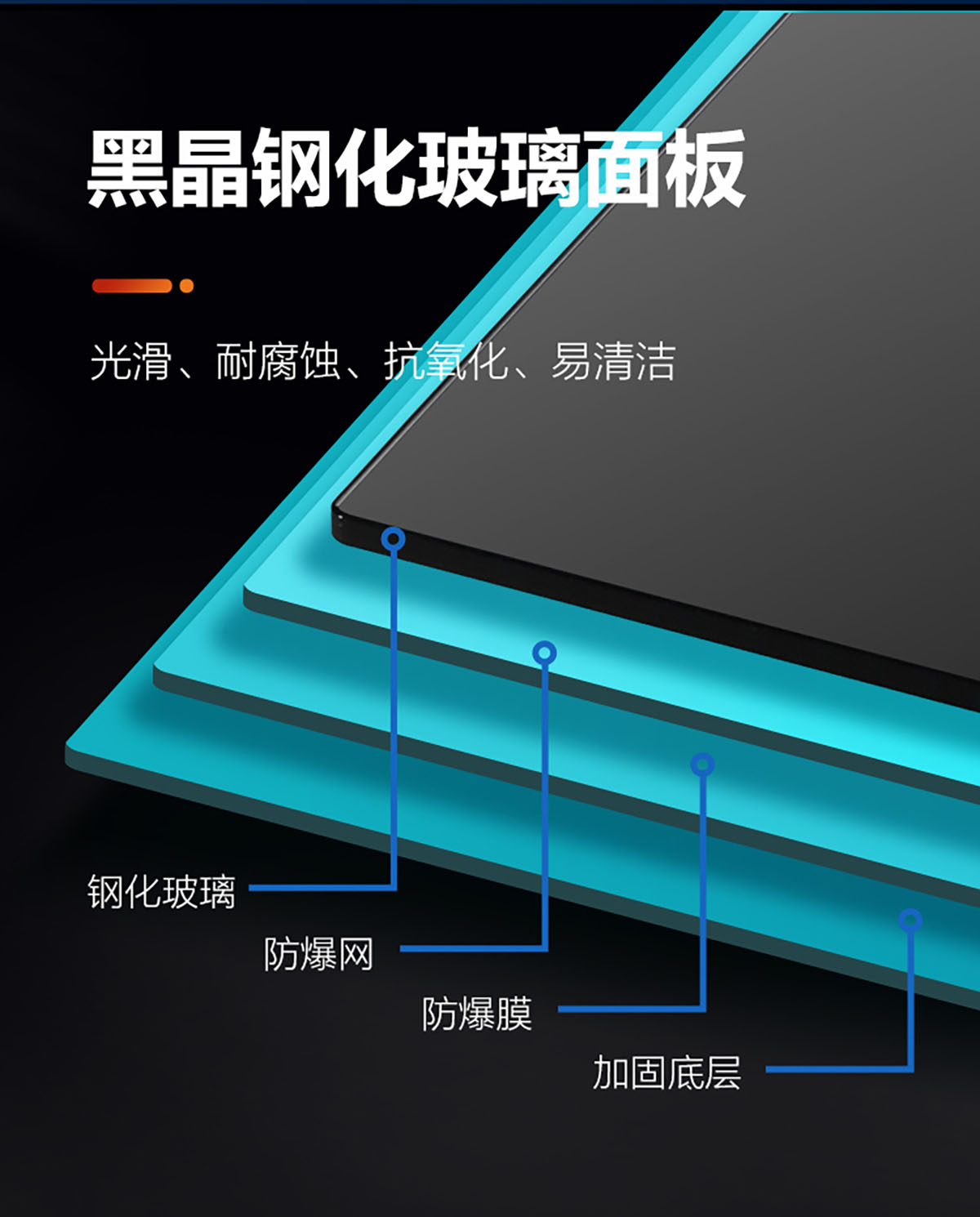 • 光滑、耐腐蝕、抗氧化、易清潔鋼化玻璃面板