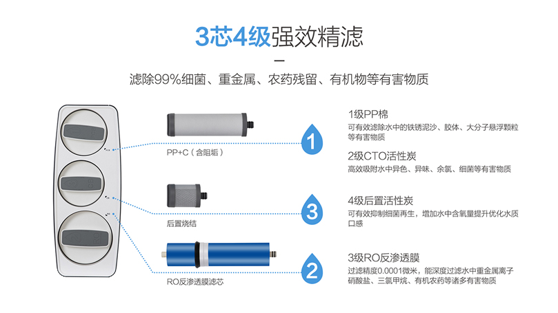 - 三芯四級強(qiáng)效精濾,濾除99%細(xì)菌重金屬