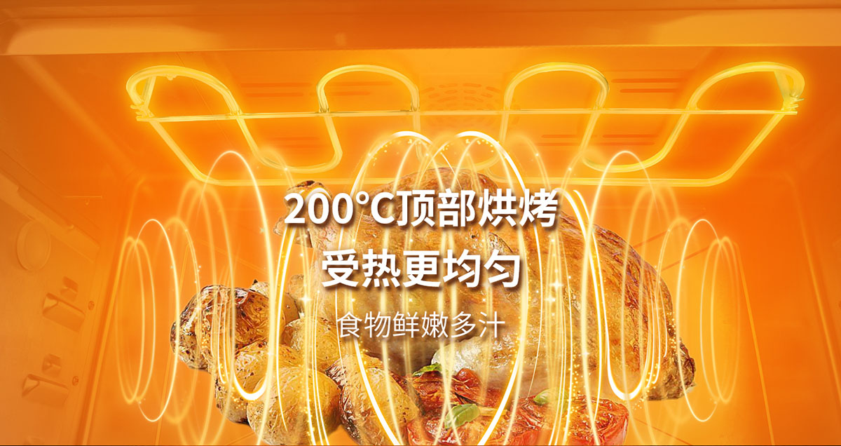 - 200℃頂部烘烤,受熱更均勻,食物鮮嫩多汁