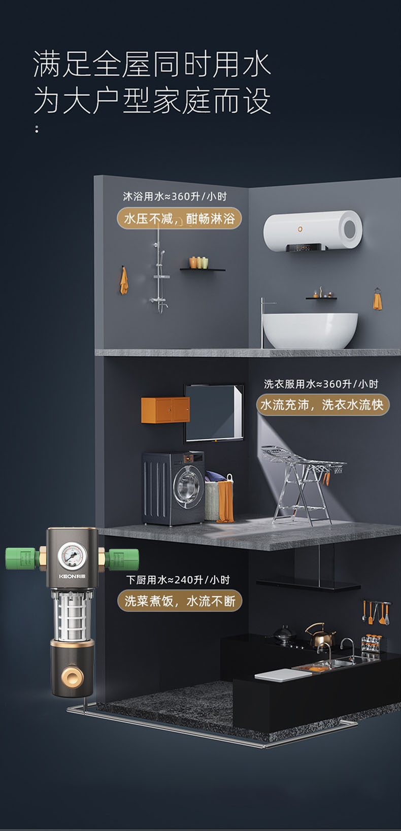- 6噸/小時(shí)大流量,快速過(guò)濾,全屋用水無(wú)壓力