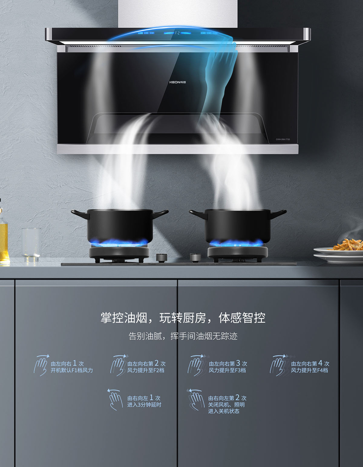 - 體感智控,揮手間油煙無蹤,杜絕油膩