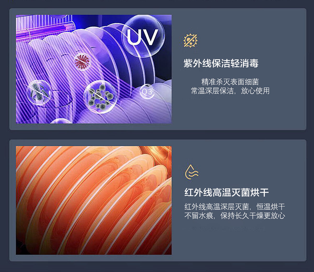 - 臭氧+紫外線+遠(yuǎn)紅外線三重立體消殺,餐具清新又干爽