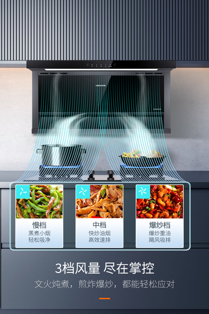 - 3檔風(fēng)量,盡在掌控。無論文火燉煮,煎炒小炒還是中式爆炒,都能輕松應(yīng)對。