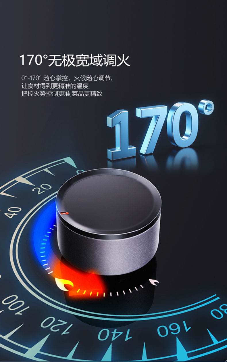 - 無極寬域調(diào)火,0°-170° 隨心掌控,火候自如